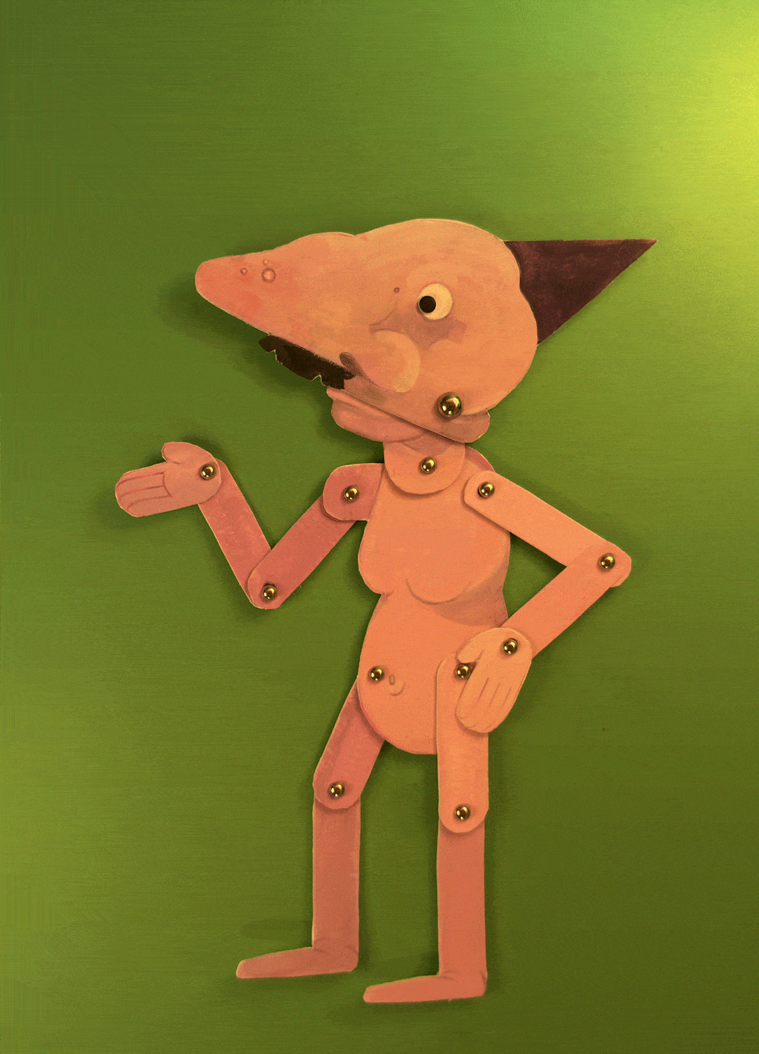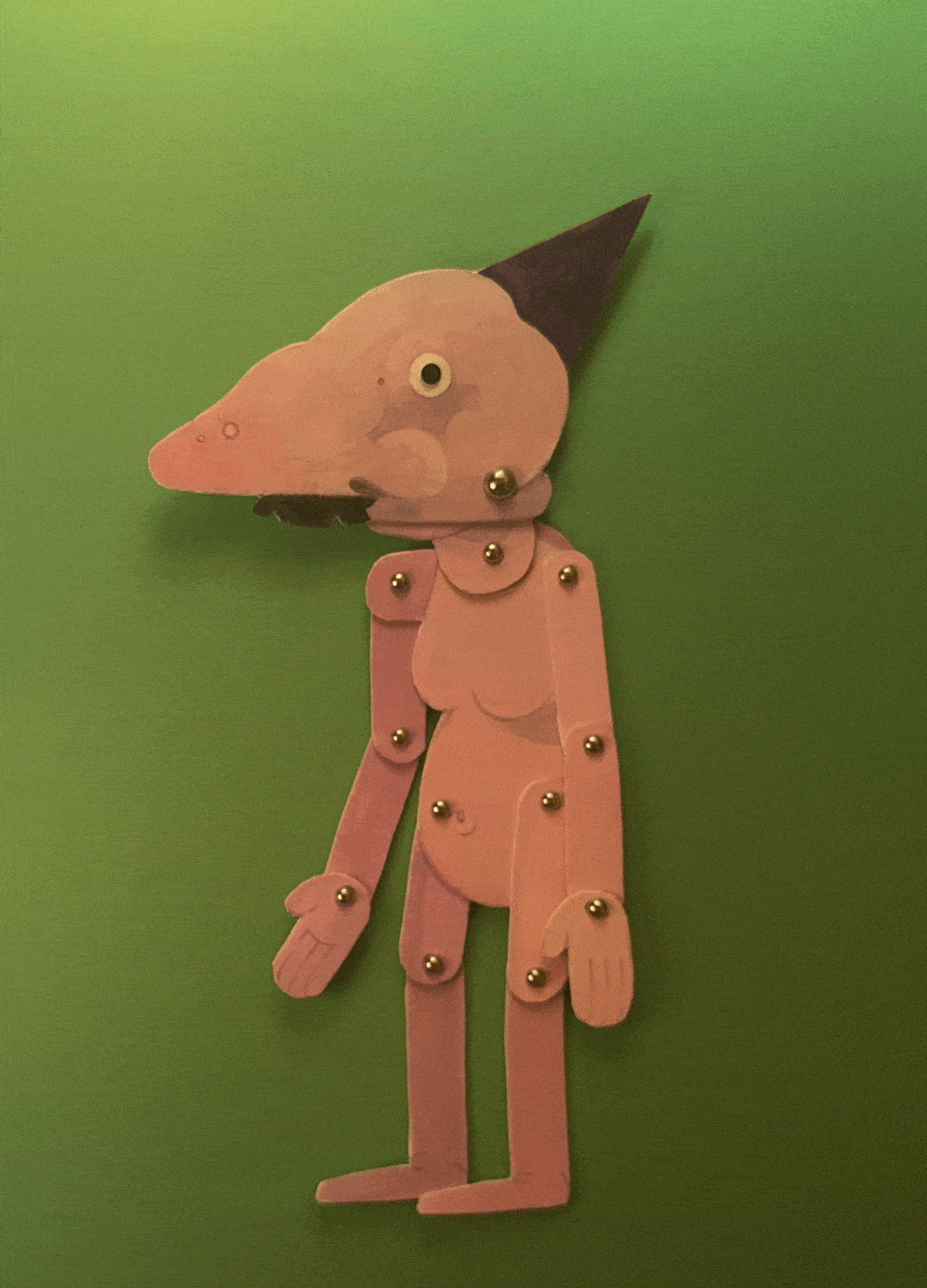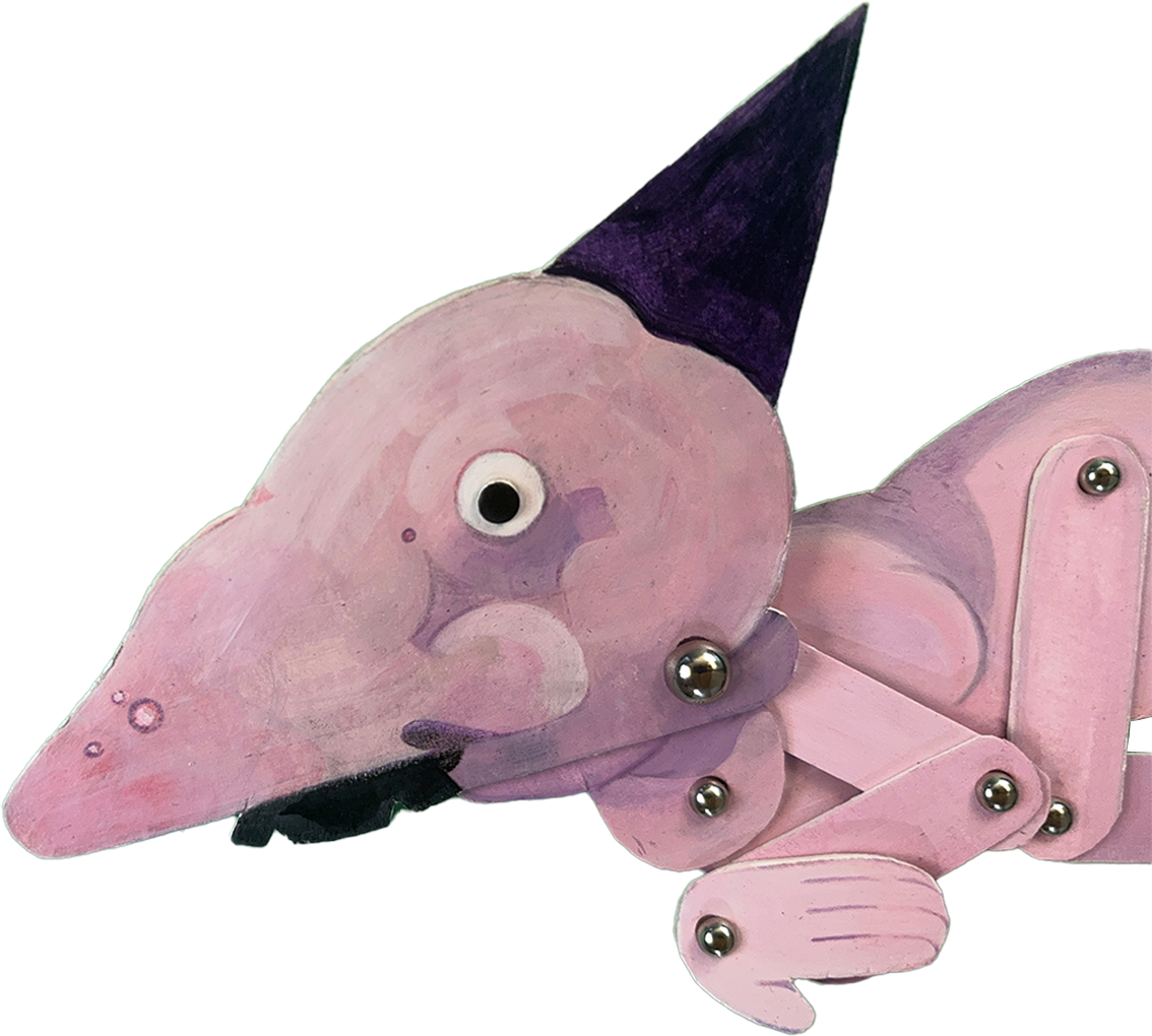 Pinkus Pork was drawn digitally before being fabricated using thick cardstock paper, acrylic paint, and colored pencils. The puppet’s hinges are visible through silver brad fasteners, a conscious choice meant to emphasize the film’s multimedia nature.